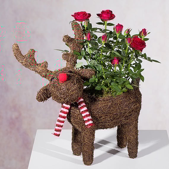 Add a touch of festive charm to your home with this cute reindeer planter filled with a beautiful red Rose. This planter measures approximately 32cm in height.